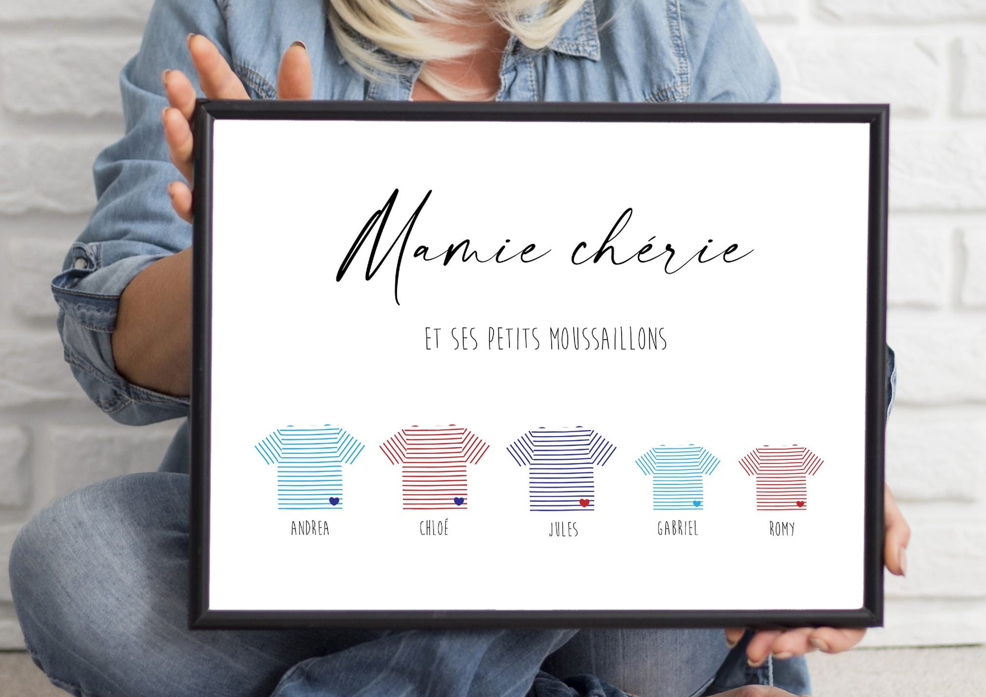 Cette affiche personnalisée illustrée représente Mamie et ses petits moussaillons, en version marinière évidemment !