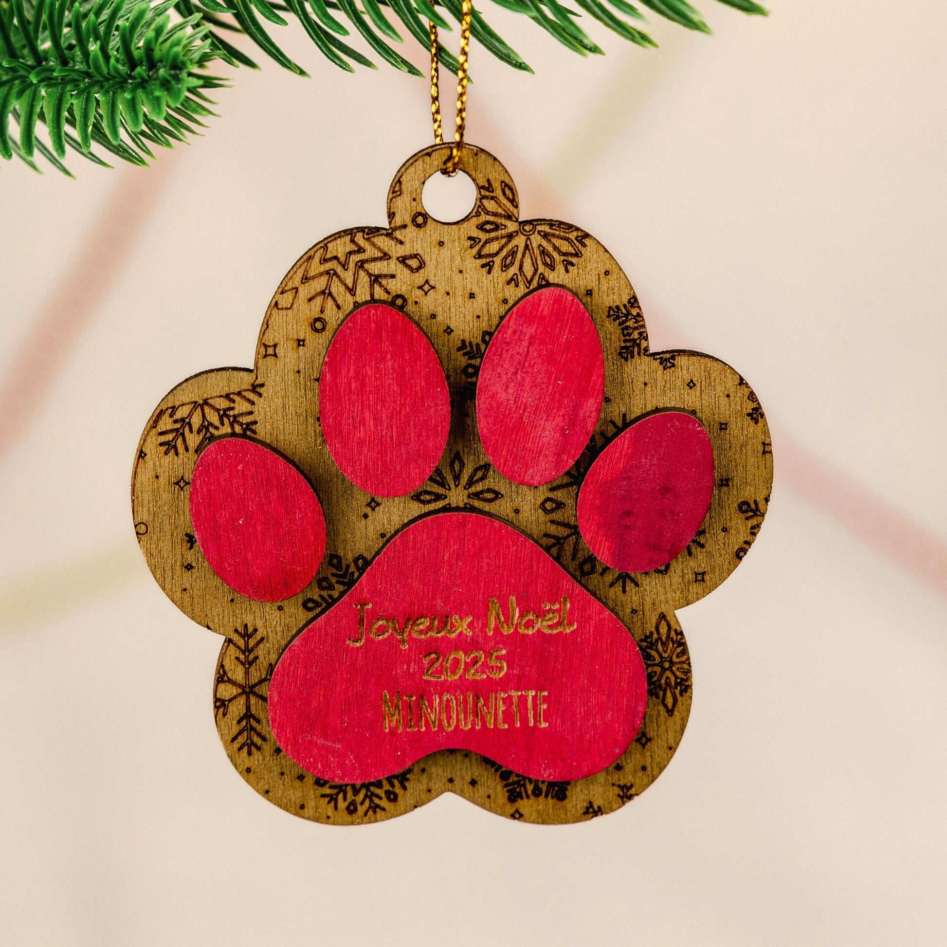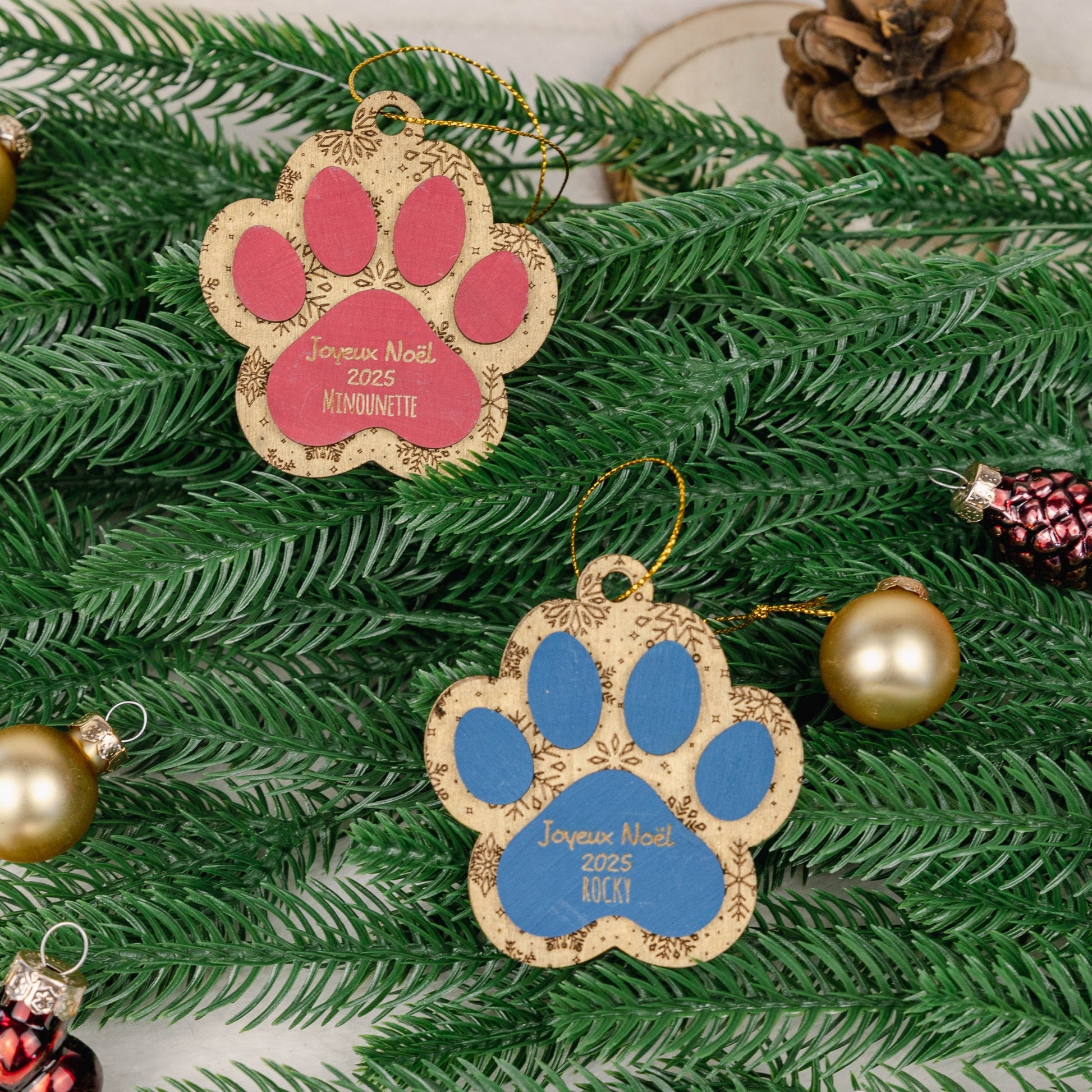 Cette boule de Noël en bois, en forme d’empreinte de chat ou de chien, est gravée de flocons de neige et personnalisée avec le nom de votre animal.