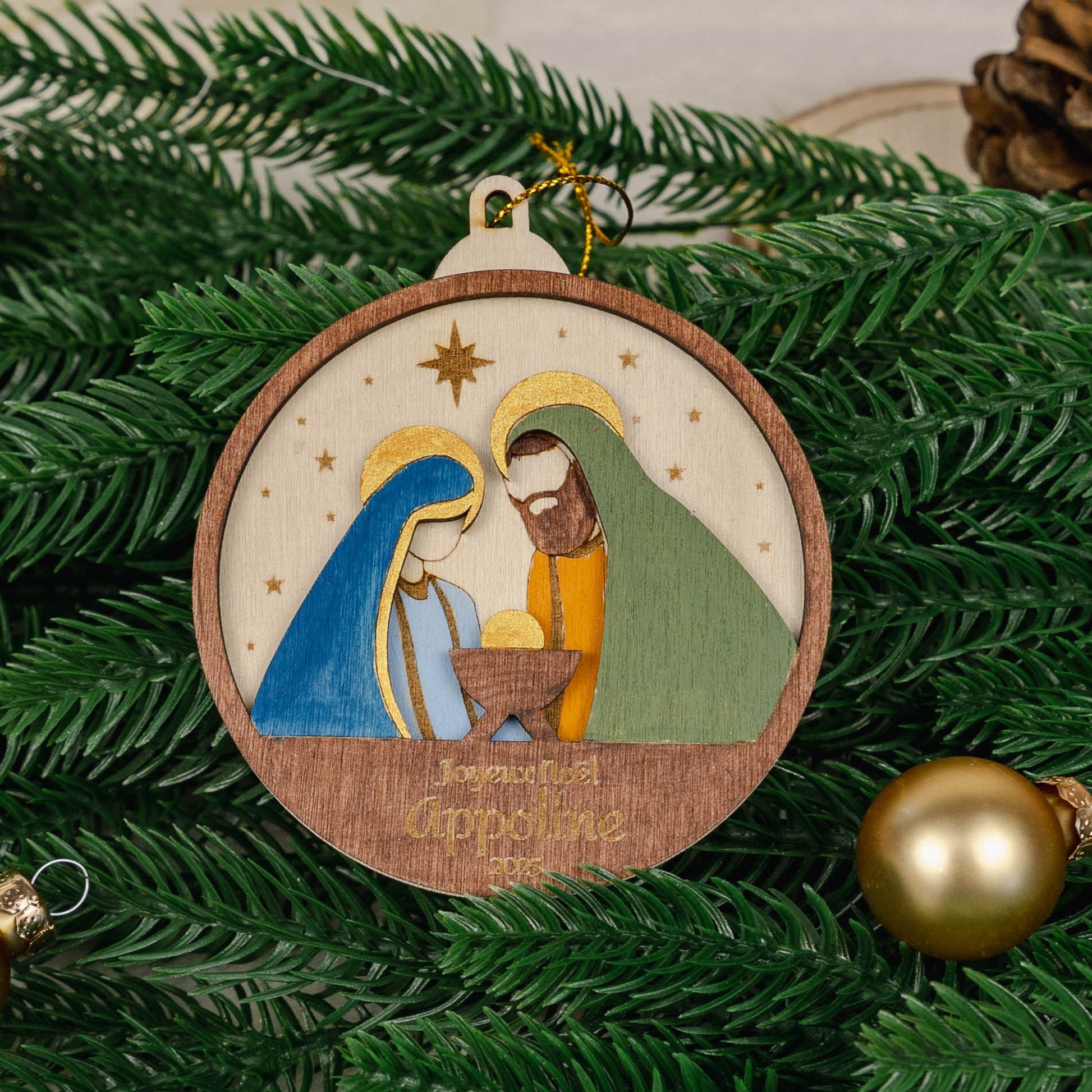 Apportez la magie de la Nativité à votre sapin avec cette boule de Noël en bois en relief.