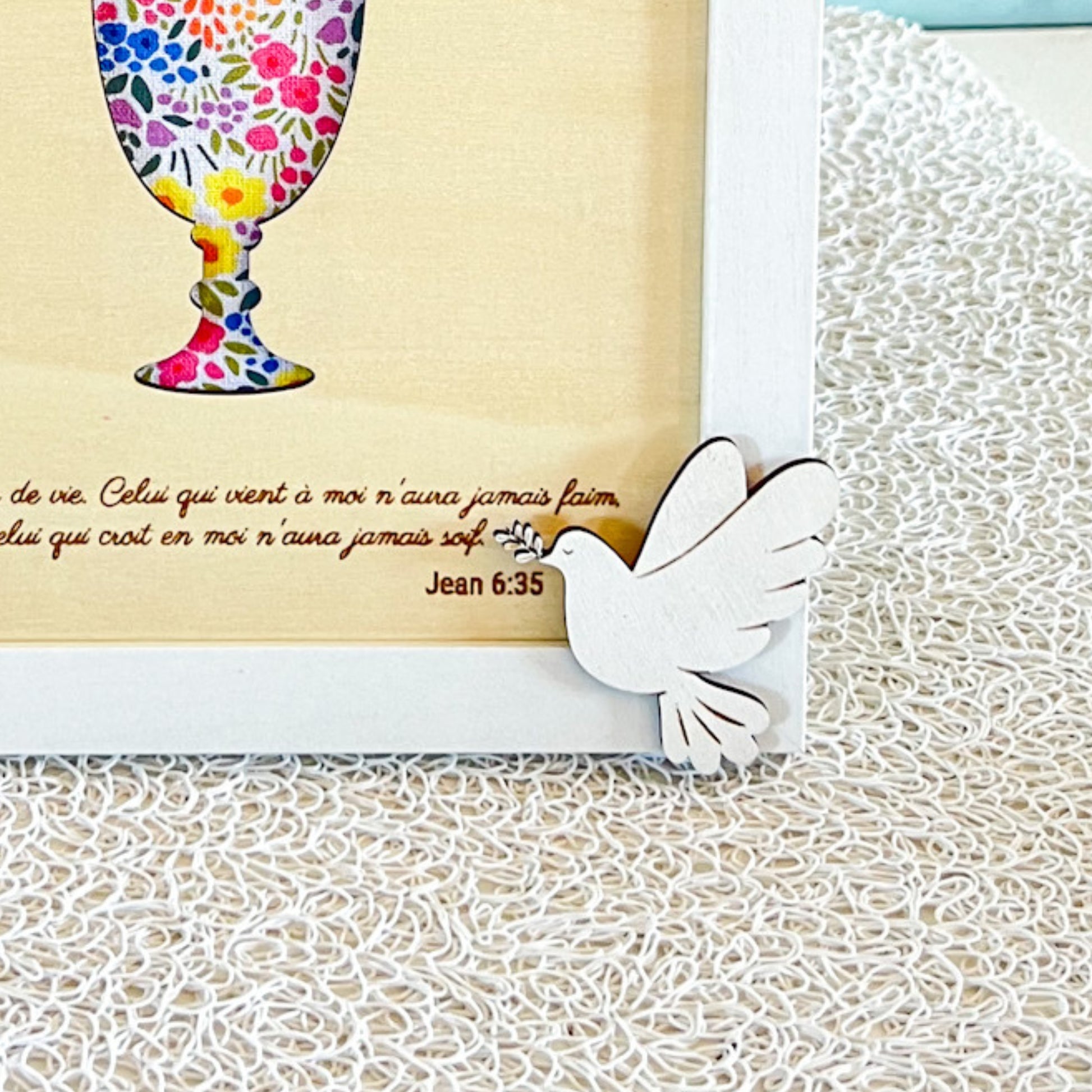 - D’un cadre blanc orné de papillons en dentelle et d’une colombe blanche en bois, symbole de paix et de pureté.