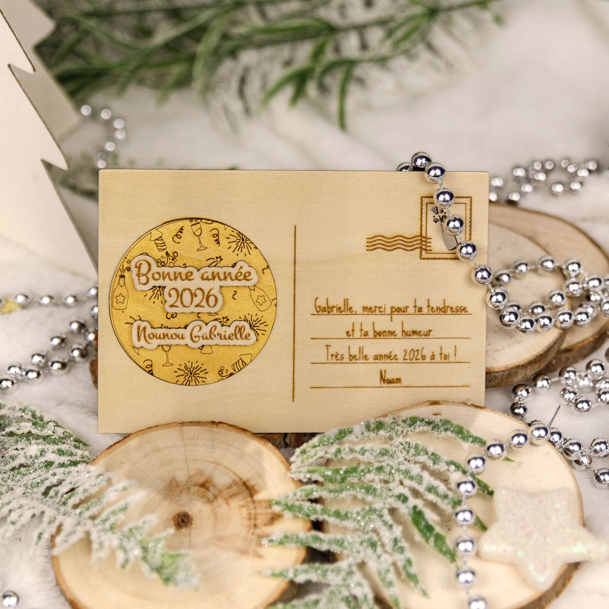 Souhaitez une Bonne année 2026 de façon unique avec cette carte postale en bois gravée et peinte à la main.