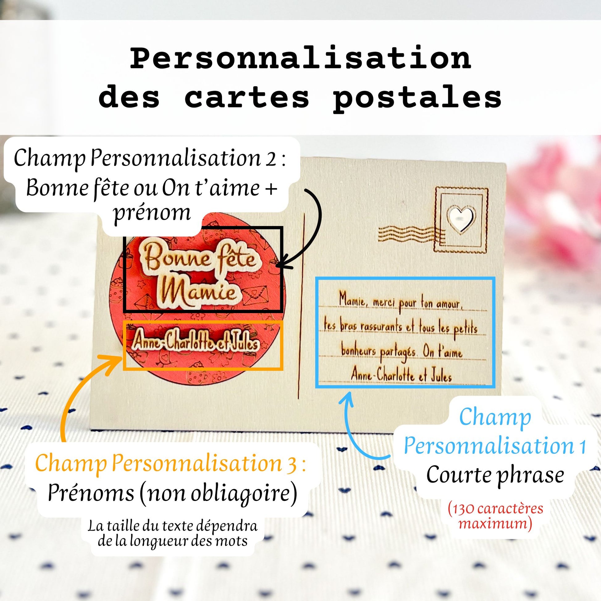 - 1 champ : votre message personnalisé sur la carte postale à droite – 130 caractères maximum (espaces compris)