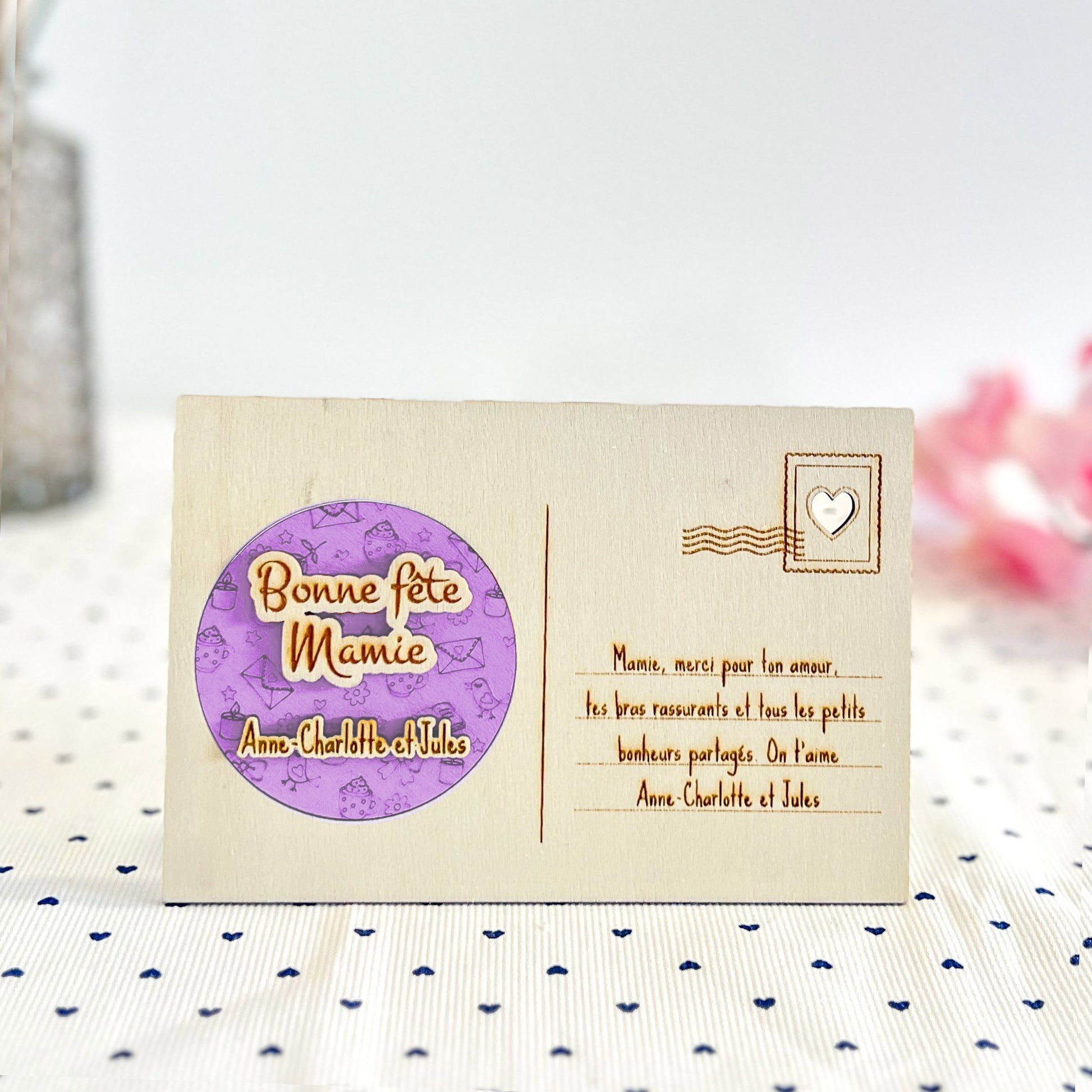 Souhaitez une bonne fête ou dites je t’aime de façon originale et durable avec cette carte postale en bois personnalisée.