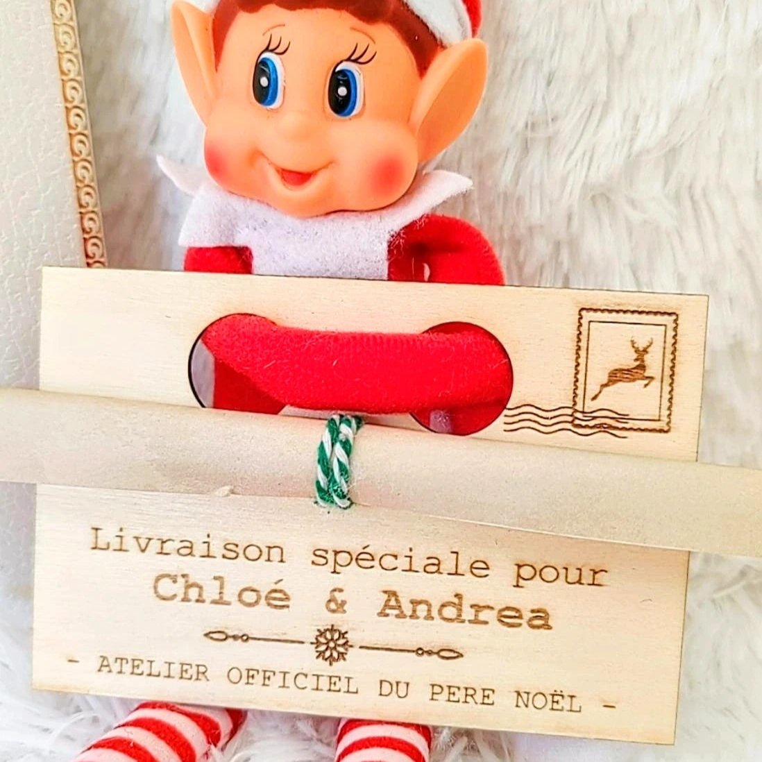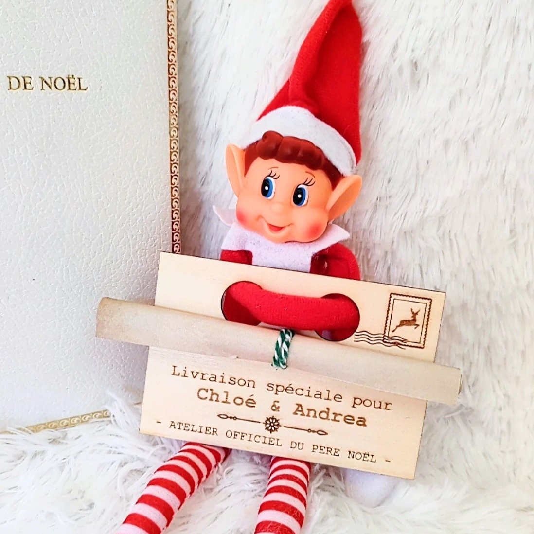 Un Support en Bois Personnalisé : Notre support en bois est conçu pour accueillir les bras de votre Elfe et est également personnalisé au prénom de vos enfants, ajoutant une touche unique à votre décor de Noël.