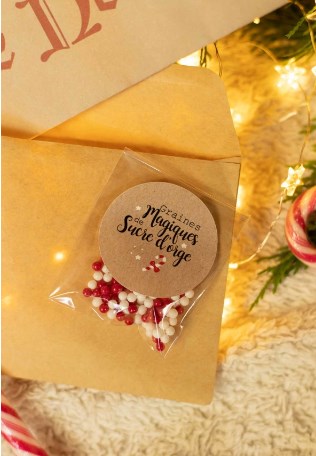 Un petit sachet contenant des billes de sucre comestibles, présentées comme des graines magiques.