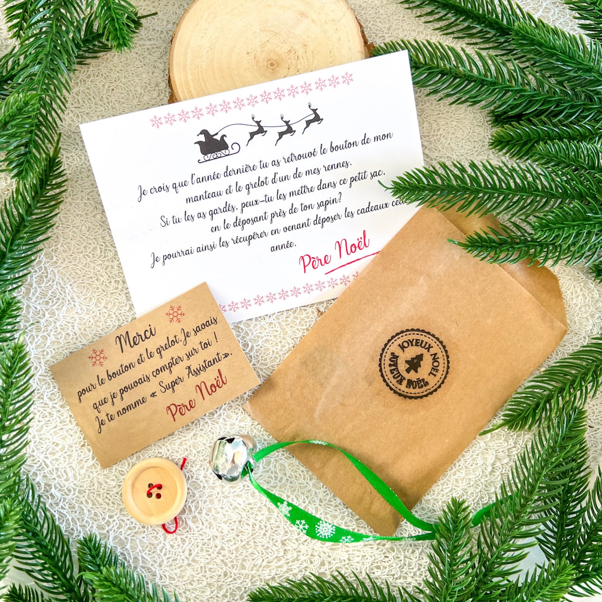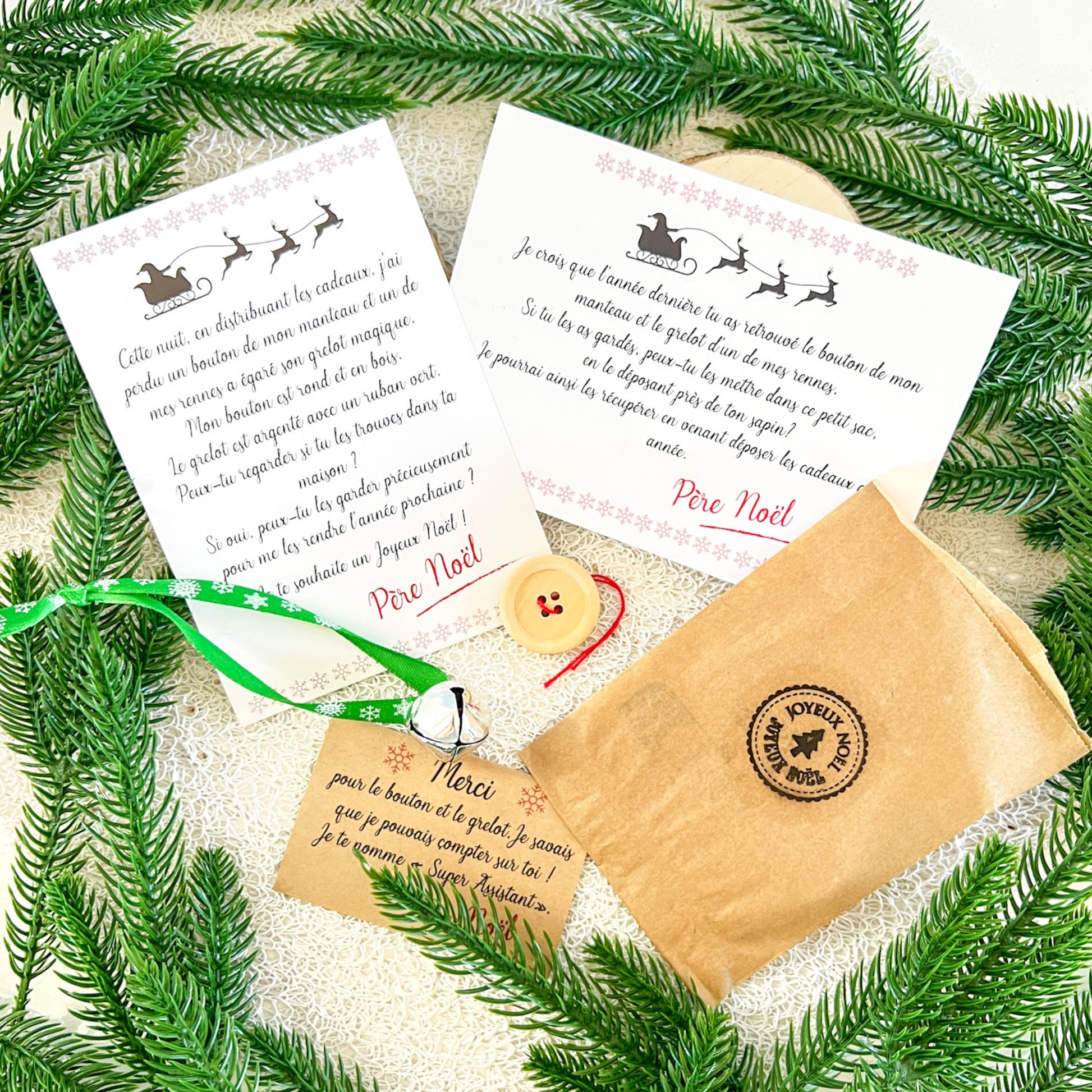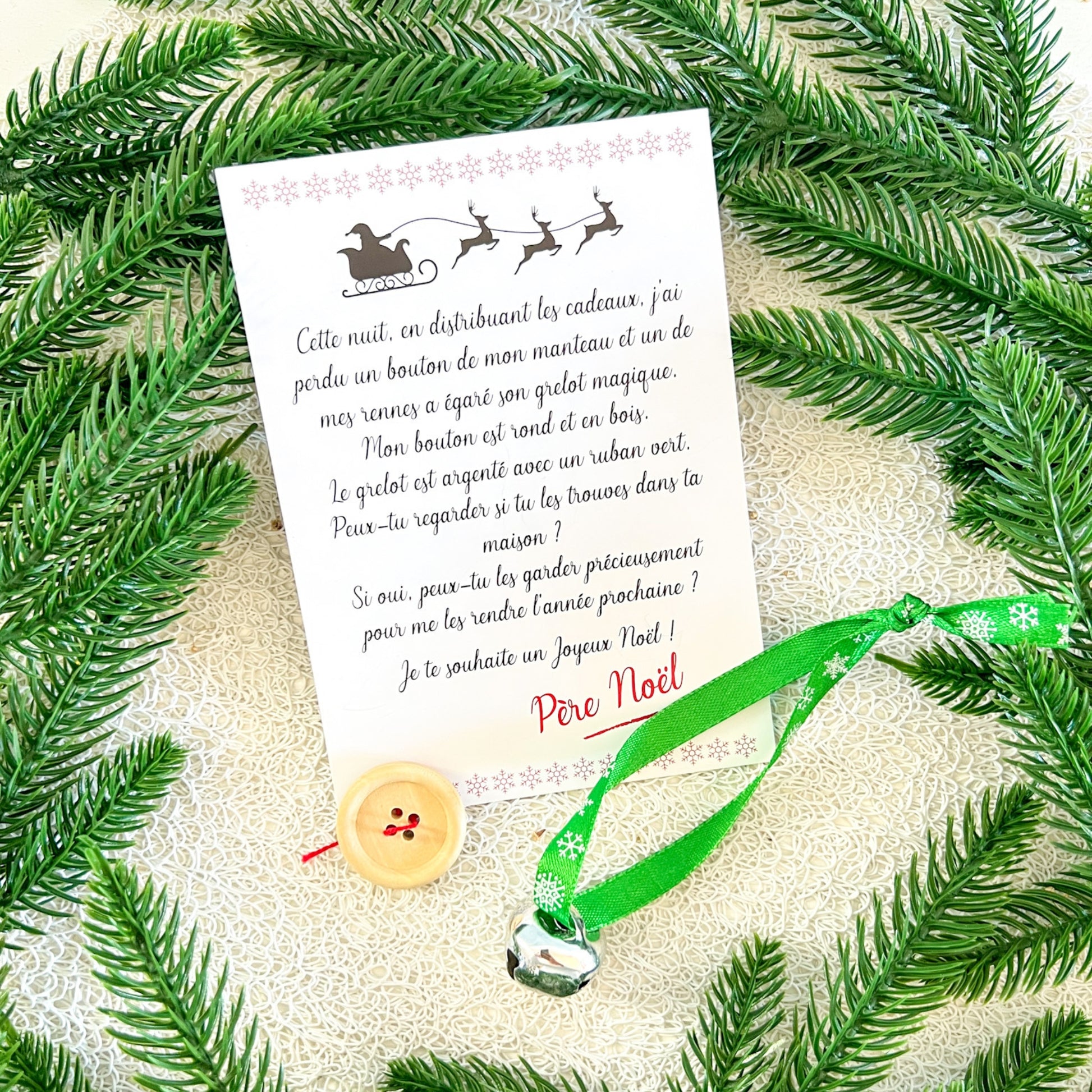 - Une carte du Père Noël (A6) invitant l’enfant à déposer le grelot et le bouton dans une petite pochette (incluse) sous le sapin la veille de Noël.