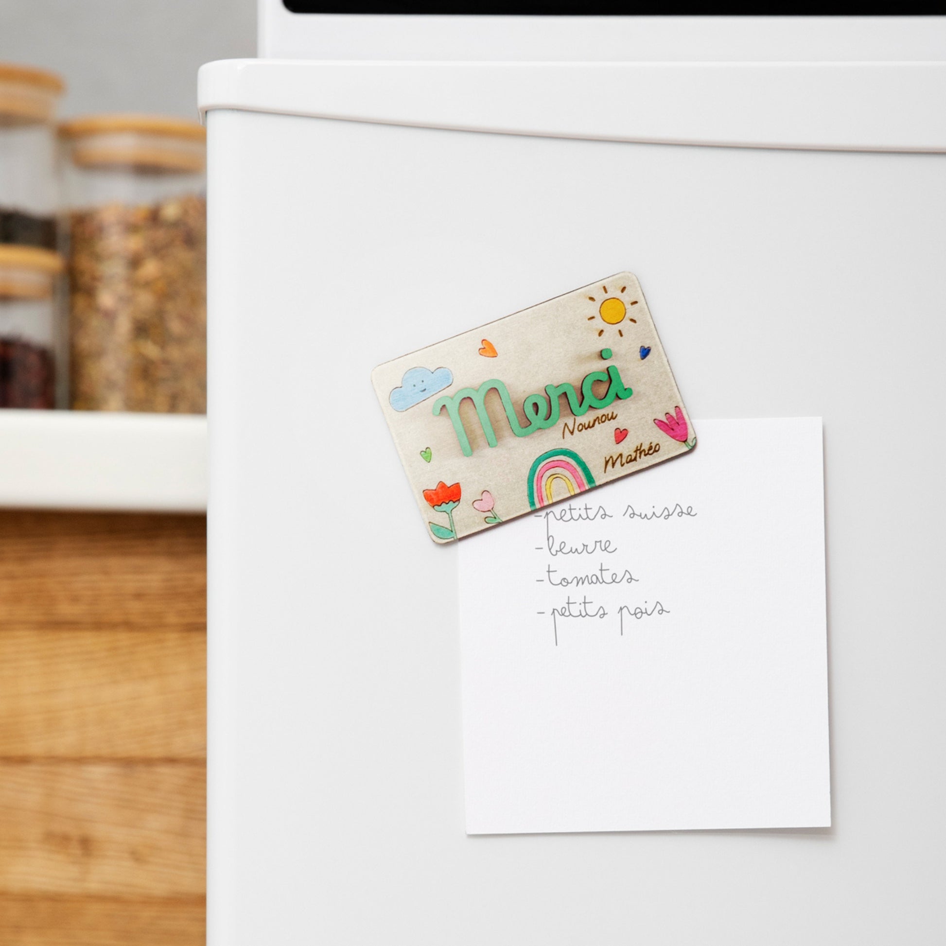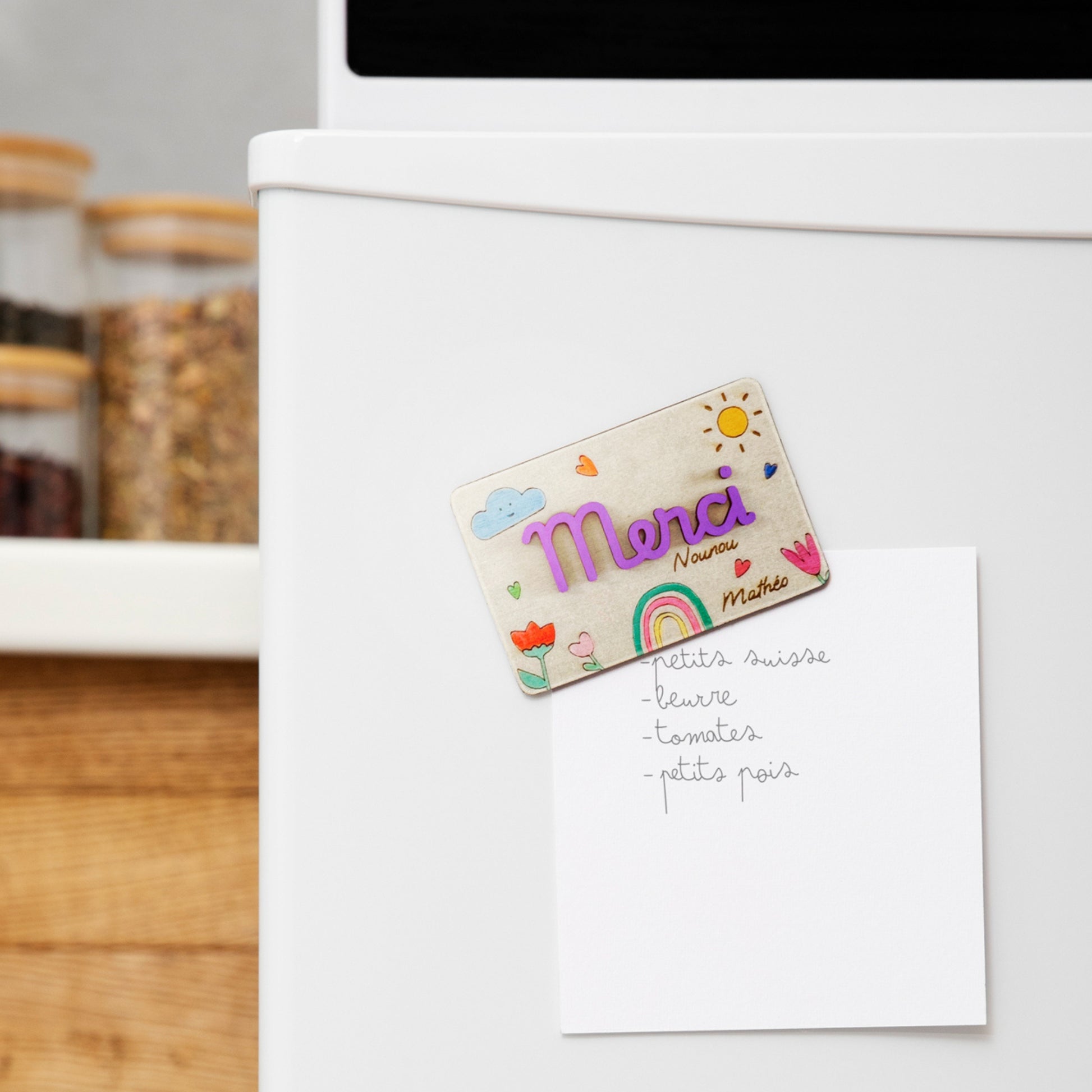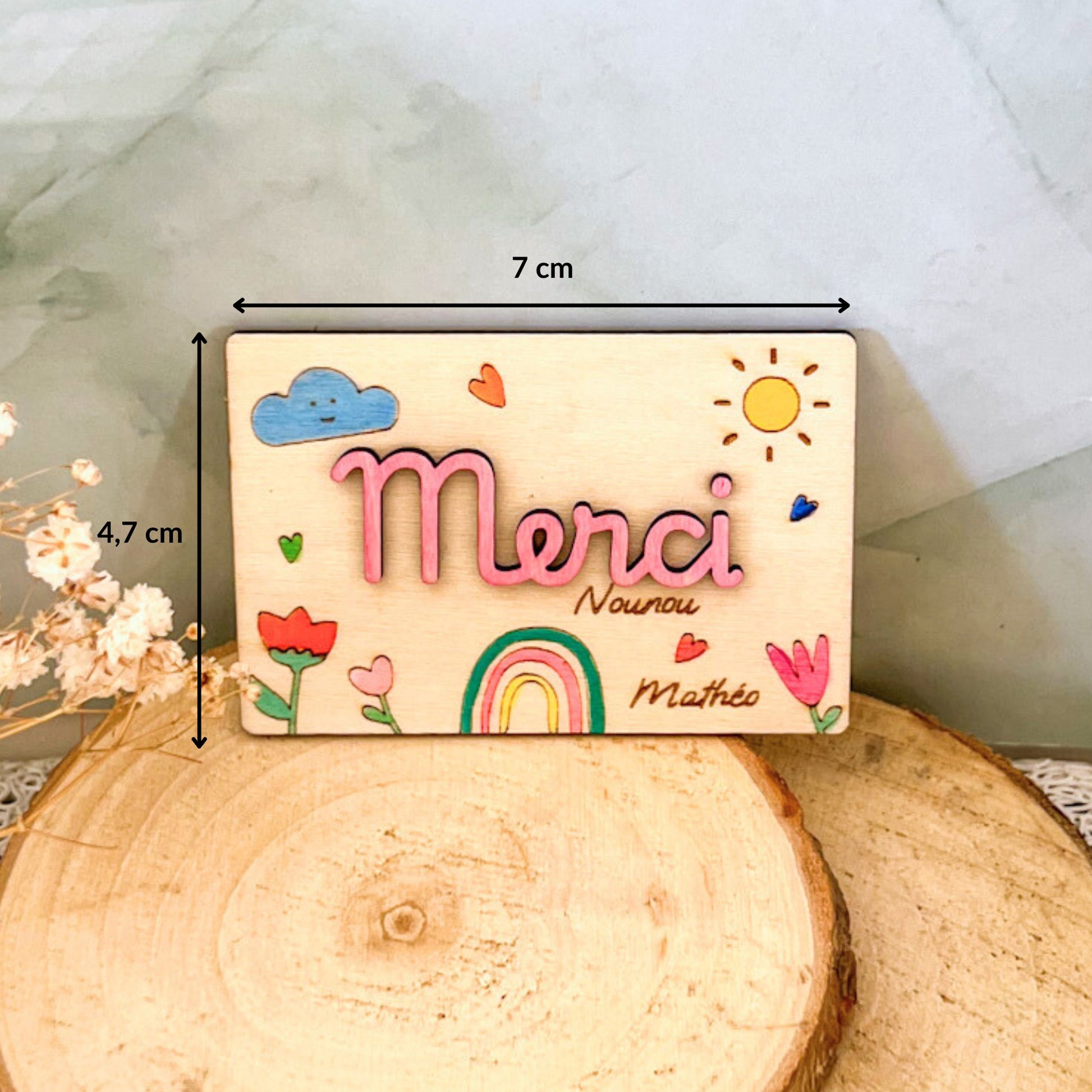 Offrez un souvenir délicat et personnalisé avec notre magnet en bois MERCI, conçu et fabriqué avec soin dans notre atelier. Parfait pour remercier une maîtresse, un maître, une ATSEM ou une assistante maternelle, ce magnet est un joli symbole de gratitude qui trouvera sa place sur un réfrigérateur ou un tableau magnétique.