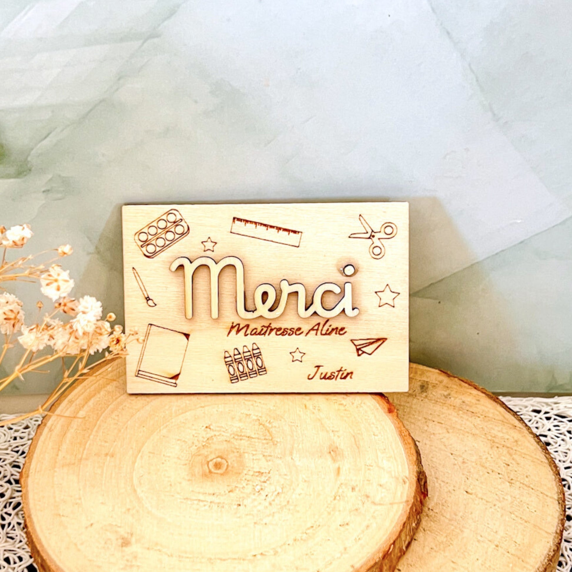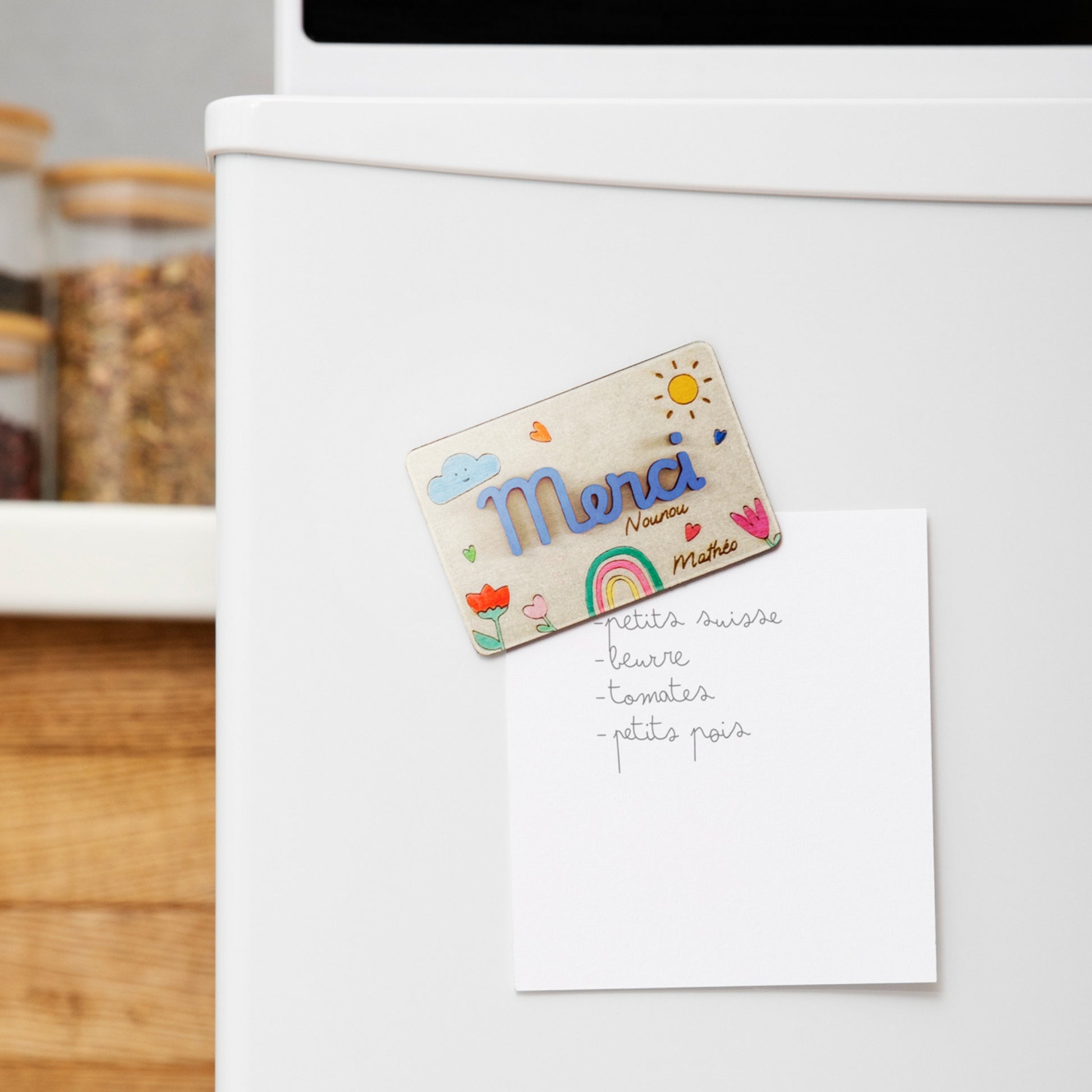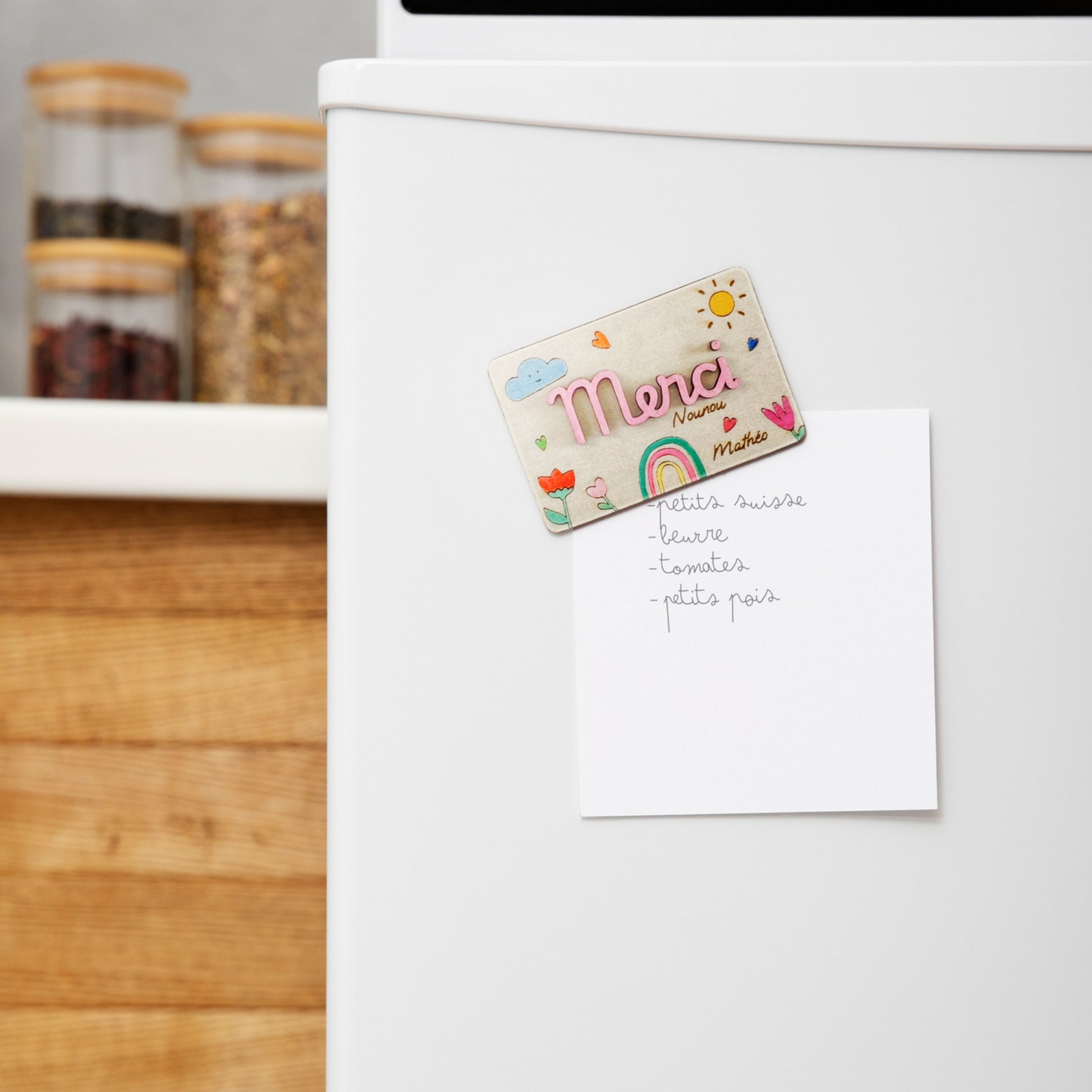 Offrez un souvenir délicat et personnalisé avec notre magnet en bois MERCI, conçu et fabriqué avec soin dans notre atelier. Parfait pour remercier une maîtresse, un maître, une ATSEM ou une assistante maternelle, ce magnet est un joli symbole de gratitude qui trouvera sa place sur un réfrigérateur ou un tableau magnétique.